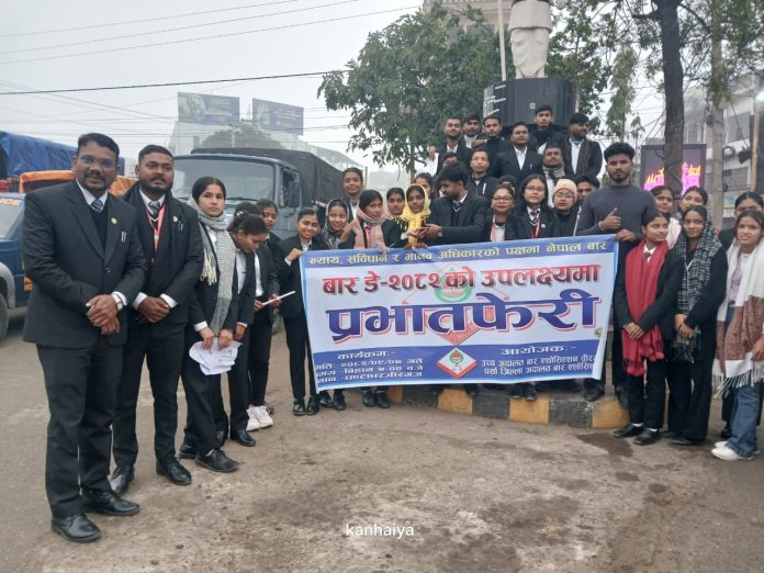 वीरगंज, ०७ पुस । वीरगंजमा न्याय, संविधान र मानव अधिकारको पक्षमा नेपाल बारको अभियान अन्तर्गत बार डे–२०८२ को अवसरमा आज बिहान वीरगंजमा प्रभातफेरी कार्यक्रम सम्पन्न भएको छ।उच्च अदालत बार एसोसिएसन वीरगंज तथा पर्सा जिल्ला अदालत बार एसोसिएसनको संयुक्त आयोजनामा सम्पन्न प्रभातफेरी वीरगंजको घण्टाघर चोकबाट सुरु भई वीरगंज बजार परिक्रमा गर्दै पुनः घण्टाघरमै पुगेर सम्पन्न भएको थियो ।