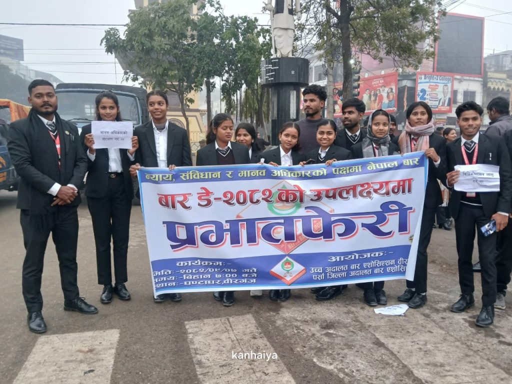 वीरगंज स्कुल अफ ल का कानून अध्ययनरत बिए एल एल बि का विद्यार्थीहरु द्वारा ब्यानर तथा हातमा प्लेकार्ड बोकेर निकालिएको प्रभातफेरीमा बिहान ७ बजेदेखि कानून व्यवसायी, कानून अध्ययनरत विद्यार्थी तथा अन्य सरोकारवालाहरूको उल्लेख्य सहभागिता रहेको थियो ।