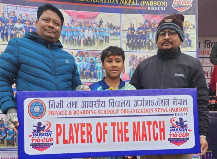 वीरगंज, १४ पुष । निजी तथा आवासीय विद्यालय संगठन (प्याब्सन) वीरगंजको आयोजनामा जारी दोस्रो संस्करणको प्याब्सन टी–१० गर्ल्स एण्ड जुनियर बोयज क्रिकेट प्रतियोगिता अन्तर्गत आदर्शनगरस्थित रंगशालामा विभिन्न विद्यालय बीचका रोमाञ्चक खेलहरू सम्पन्न भएका छन् । प्रतियोगितामा छात्र तथा छात्रा दुवै समूहका टोलीहरूले उत्साहजनक र प्रतिस्पर्धात्मक प्रदर्शन प्रस्तुत गरेका छन् ।