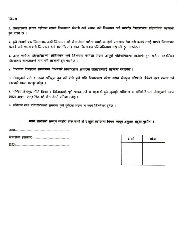 मधेश खेलकुद परिषद् पर्सा जिल्ला खेलकुद विकास समितिका अध्यक्ष दिपक कुमार साह कानुद्वारा जारी सूचनाअनुसार, २०८२ साल पौष ३० गतेदेखि माघ १० गतेसम्म १० औँ राष्ट्रिय खेलकुद प्रतियोगिता का लागि नयाँ खेलाडी दर्ता फाराम संकलन गरिनेछ।