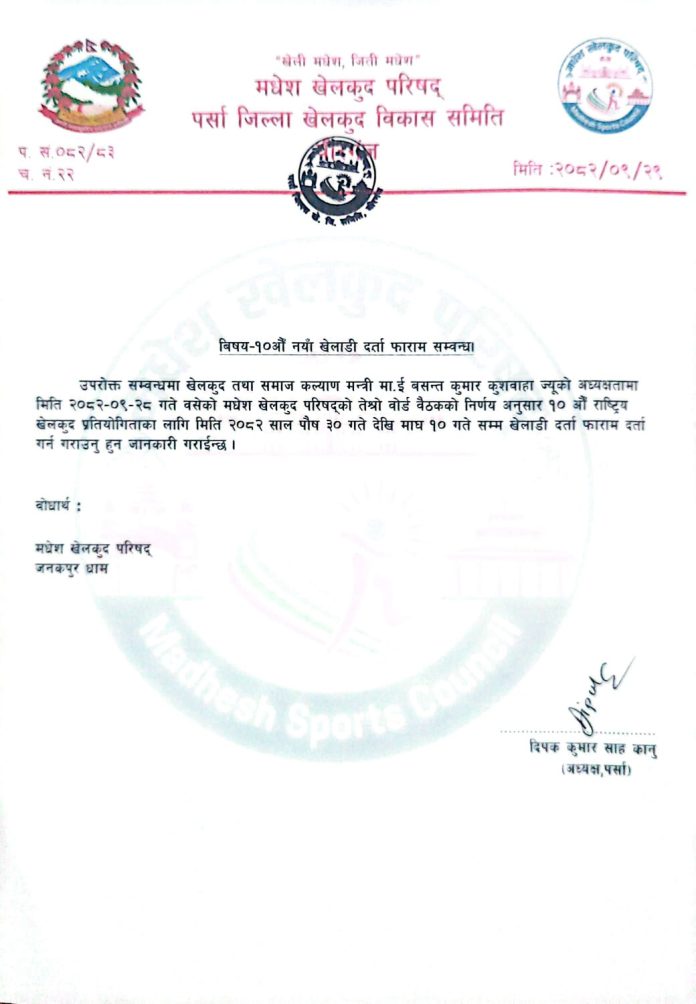 मधेश खेलकुद परिषद् पर्सा जिल्ला खेलकुद विकास समितिका अध्यक्ष दिपक कुमार साह कानुद्वारा जारी सूचनाअनुसार, २०८२ साल पौष ३० गतेदेखि माघ १० गतेसम्म १० औँ राष्ट्रिय खेलकुद प्रतियोगिता का लागि नयाँ खेलाडी दर्ता फाराम संकलन गरिनेछ।