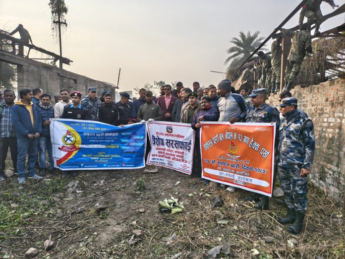 वीरगंज, १० माघ । ग्रीनसिटि सामुदायिक प्रहरी, सशस्त्र प्रहरी बल, वीरगंज महानगरपालिकाको नगर प्रहरी, राष्ट्रिय सेवा दल तथा नेपाल प्रहरीको संयुक्त आयोजनामा वीरगंजमा बृहत सरसफाई कार्यक्रम सम्पन्न भएको छ। वर्षौँदेखि बेवारिसे अवस्थामा रहँदै आएको घण्टाघरस्थित रेल्वे जग्गा फोहोरले अस्तव्यस्त बनेको अवस्थामा उक्त सरसफाई अभियान सञ्चालन गरिएको हो ।
