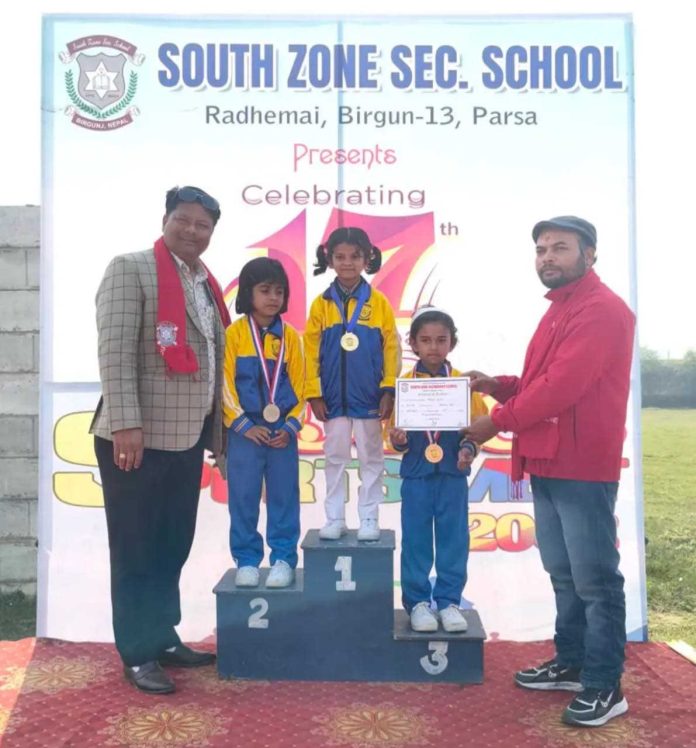 वीरगंज, २० माघ । वीरगंज महानगरपालिका वडा नं. १३ राधे माईस्थित साउथ जोन माध्यमिक विद्यालयको १७ औँ स्थापना दिवसको अवसरमा आयोजना गरिएको सप्ताव्यापी कार्यक्रम अन्तर्गत मङ्गलबार नर्सरीदेखि कक्षा २ सम्मका विद्यार्थीहरूका लागि जुनियर खेलकुद कार्यक्रम उत्साहपूर्ण वातावरणमा सम्पन्न भएको छ।