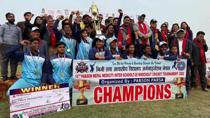 वीरगंज, २४ माघ। १० औं प्याब्सन नेपाल मेडिसिटी अन्तर विद्यालय टि–२० नकआउट क्रिकेट प्रतियोगिताको उपाधि मुनलाईट माविले उचालेको छ। प्याब्सन पर्साको आयोजनामा गत माघ ८ गतेदेखि शुरु भएको सर्वाधिक ४० विद्यालय सहभागी प्रतियोगिताको शनिबार सम्पन्न फाइनल खेलमा सनलाईट माविलाई ३ विकेटले पराजित गर्दै मुनलाईटले उपाधि उचालेको हो। गत संस्करणको समेत विजेता रहेको मुनलाईटका बलर र ब्याट्सम्यान दुवैको शानदार प्रदर्शनले सनलाईट स्तब्ध बन्यो र उपविजेतामा सीमित रहन पुग्यो।