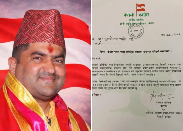 नेपाली कांग्रेसका केन्द्रीय कार्यालयले ज्योतिष सम्राट डा. पुरुषोतम दुबे लाई केन्द्रीय प्रचार–प्रसार समिति सदस्यमा मनोनित