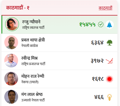 उनलाई नेपाली कांग्रेसका उम्मेदवार प्रबल थापा क्षेत्रीले पछ्याइरहेका छन्, जसले ६,३६४ मत प्राप्त गरेका छन्। त्यस्तै, राष्ट्रिय प्रजातन्त्र पार्टीका रवीन्द्र मिश्रले ३,१७२ मत प्राप्त गरी तेस्रो स्थानमा रहेका छन् भने नेकपा (एमाले) का मोहन राज रेग्मीले १,६१८ मत ल्याएका छन्। उज्यालो नेपाल पार्टीका मंग लाल श्रेष्ठले भने ४६६ मत प्राप्त गरेको देखिन्छ। यसरी हेर्दा काठमाडौँ-१ मा अन्य प्रतिस्पर्धीहरूको तुलनामा राष्ट्रिय स्वतन्त्र पार्टीकी रञ्जु न्यौपाने भारी मतले अगाडि देखिएकी छिन्।