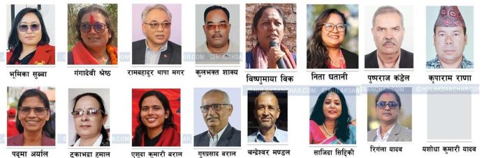 समानुपातिक सांसदको नामावली यस प्रकार छः जनजाति (४ जना) महिलाः भूमिका सुब्बा, गंगादेवी श्रेष्ठ पुरूषः रामबहादुर थापा मगर, कुलभक्त शाक्य खसआर्य (५ जना) महिलाः पद्मा अर्याल, टुकाभद्रा हमाल, एशुदा कुमारी बराल (पिछडिएको क्षेत्र) पुरूषः गुरूप्रसाद बराल, पुष्पराज कंडेल थारू (१ जना) पुरूषः कृपाराम राणा दलित (२ जना) महिलाः विष्णुमाया वी.के., नीता घटानी मधेसी (३ जना) महिलाः रिङ्ला यादव, यशोधा कुमारी यादव पुरूषः चन्द्रेश्वर मण्डल मुस्लिम (१ जना) महिलाः साजिदा सिद्दीकी रहेका छन् ।