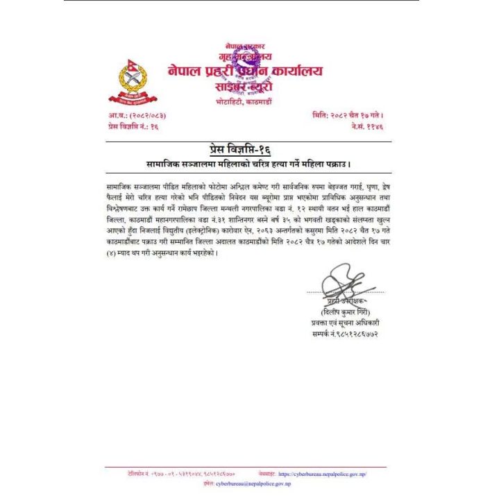सामाजिक सञ्जालमा पीडित महिलाको फोटोमा अश्लिल कमेण्ट गरी सार्वजनिक रूपमा बेइज्जत गराई, घृणा, द्वेष फैलाई मेरो चरित्र हत्या गरेको भनि पीडितको निवेदन ब्यूरोमा प्राप्त भएकोमा प्राविधिक अनुसन्धान तथा विश्लेषणबाट उक्त कार्य गर्ने रामेछाप जिल्ला मन्थली नगरपालिका वडा नं. १२ स्थायी वतन भई हाल काठमाडौं जिल्ला, काठमाडौं महानगरपालिका वडा नं. ३१ शान्तिनगर बस्ने वर्ष ३५ को भगवती खड्काको संलग्नता खुल्न आएको हुँदा उनलाई पक्राउ गरिएको प्रवक्ता एवं सूचना अधिकारी प्रहरी उपरीक्षक दिलीप कुमार गिरीले जानकारी गराएका छन् ।