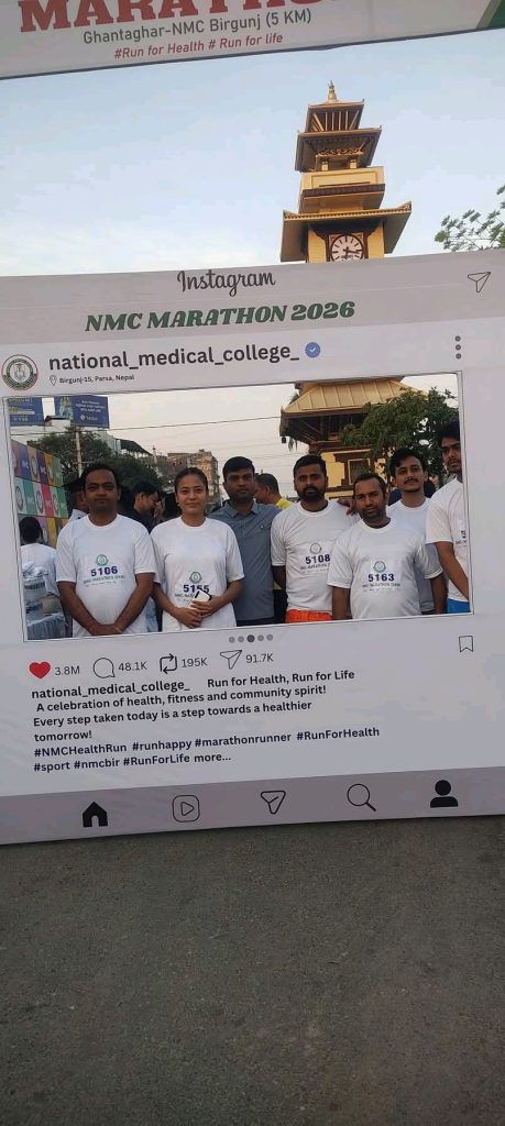 वीरगंजंज, २१ चैत्र । नेशनल मेडिकल कलेज तथा शिक्षण अस्पताल, वीरगंजद्वारा “Run for Health, Run for Life” नारासहित आयोजना गरिएको हेल्थ म्याराथन कार्यक्रम आज सफलतापूर्वक सम्पन्न भएको छ। उक्त कार्यक्रम स्पोर्ट्स वीक २०८२ अन्तर्गत आयोजना गरिएको थियो।