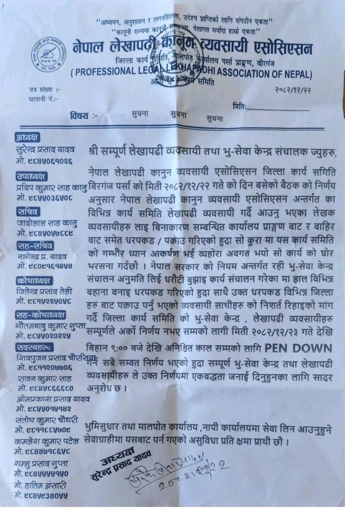 वीरगंज, २२ चैत । नेपाल लेखापढी कानुन व्यवसायी एसोसिएसन, जिल्ला कार्य समिति पर्साले विभिन्न स्थानमा लेखापढी व्यवसायीहरूलाई विनाकारण पक्राउ गरिएको भन्दै ‘पेन डाउन’ आन्दोलन घोषणा गरेको छ।