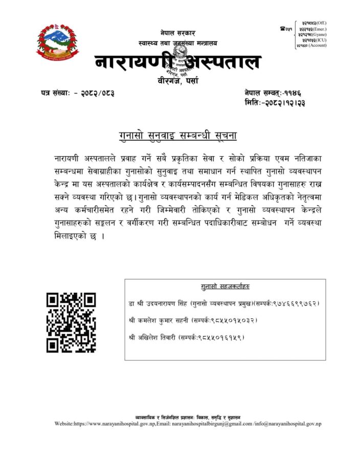 वीरगंज, २३ चैत्र । नारायणी अस्पतालले सेवा प्रवाह लाई अझ प्रभावकारी, पारदर्शी र सेवाग्राहीमैत्री बनाउन गुनासो सुनुवाइ सम्बन्धी सूचना सार्वजनिक गरेको छ। अस्पतालले प्रदान गर्ने स्वास्थ्य सेवा, प्रक्रिया तथा नतिजासँग सम्बन्धित गुनासोहरू सहज रूपमा दर्ता, सुनुवाइ तथा समाधान गर्न गुनासो व्यवस्थापन केन्द्र स्थापना गरिएको जनाएको छ।