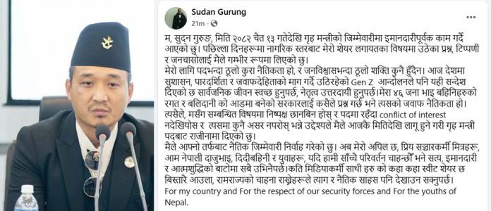 पछिल्ला दिनहरूमा नागरिक स्तरबाट आफ्नो शेयरलगायत विषयमा उठेका प्रश्न, टिप्पणी र जनचासोलाई गम्भीर रूपमा लिएको उहाँले जनाउनुभएको छ । गुरुङ गत चैत १३ गते गृहमन्त्रीमा नियुक्त हुनुभएको थियो ।