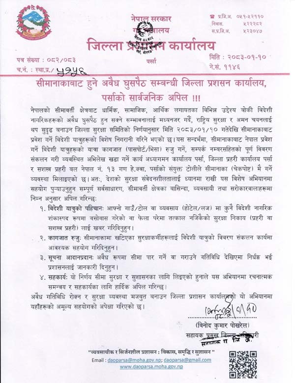 सीमानाकाबाट हुने अवैध घुसपैठ सम्बन्धी जिल्ला प्रशासन कार्यालय, पर्साको अपील