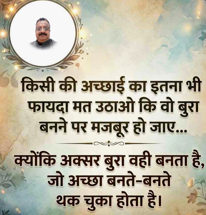 एक राम्रो अभिनेताले रंगमञ्चमा आफूलाई धेरै रूपमा देखाउँछ, त्यसैगरी जीवनको रंगमञ्चमा पनि, मानिस बाँच्दा धेरै उतारचढावहरूबाट गुज्रन्छ। जीवन एक खुशी हो। मलाई थाहा छैन कति ऋषि-सन्तहरूले यसको खोजीमा तपस्या गरे, तर अझै पनि तिनीहरूले यसलाई फेला पारेनन्। त्यसैले, हरेक परिस्थितिमा सधैं खुशी रहनुहोस्।