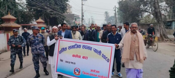 वीरगंज, ९ फागुन । बाराको कलैया र जीतपुरमा बुधवार बिहान धार्मिक सामाजिक सद्भाव र्रुयाली निकालिएको छ । कलैयामा जिल्ला प्रशासन कार्यालय बाराको अगुवाई र जीतपुरमा स्थानीय धार्मिक संघसंस्थाको आयोजनामा सद्भाव र्याली निकालिएको हो ।