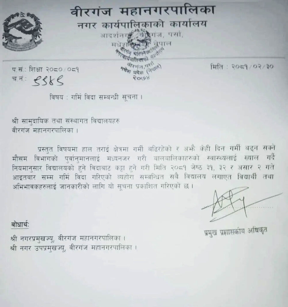बुधबार वीरगंंज महानगरपालिकाका प्रमुख प्रशासकीय अधिकृत मातृका प्रसाद भट्टराईले एक सुचना जारी गर्दै हाल गर्मी बढिरहेको र अबका केहिदिन अझ गर्मी बढ्ने मौसम विभागको पूर्वानुमानलाई मध्यनजर गरी बालबालिकाको स्वास्थ्यलाई ख्याल गर्दै विद्यालयहरुमा जेष्ठ ३१ देखि असार २ गतेसम्मका लागि गर्मी विदा दिने निर्णय गरिएको जनाएका छन् ।