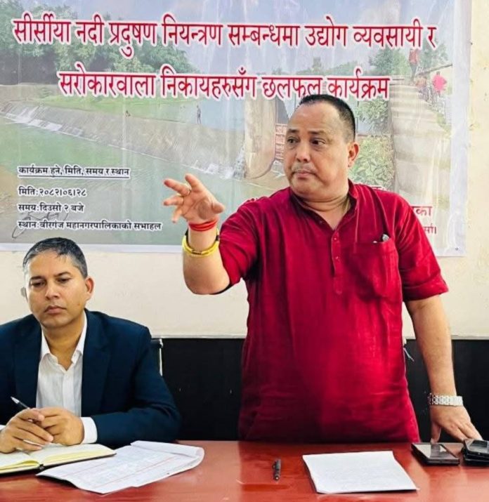 वीरगंज, २८ असोज । सिर्सिया नदीमा बढ्दो प्रदूषण नियन्त्रणका उद्देश्यले वीरगञ्ज महानगरपालिकाको पहलमा मंगलबार एक विशेष छलफल कार्यक्रम सम्पन्न भएको छ। उक्त कार्यक्रम वीरगञ्ज महानगरपालिकाका मेयर राजेशमान सिंहको अध्यक्षता तथा उपस्थितिमा सम्पन्न भएको हो।