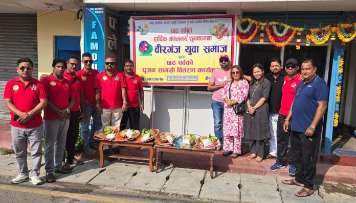 वीरगंज, ०७ कार्तिक । वीरगंज युवा समाजले छठ पुजा गर्ने बिपन्न बरतालुहरुलाई आज एक कार्यक्रम बिच छठको पुजन सामग्री वितरण गरेर कार्यक्रम सभ्य एवं भव्य रुपले सम्पन्न गरेको छ । बिरगंज युवा समाजका अध्यक्ष संजीव थापाको अध्यक्षता भएको कार्यक्रममा वीरगंज क्षेत्रका विभिन्न २५ अति विपन्न छठ बरतालुहरुलाई साड़ी, नरिवल, केरा, स्याऊ, बतासा, अगरबत्ती, सलाई, अगर्पत्ता र सिंदूर एउटा सुपलीमा सजाएर वितरण गरिएको थियो ।