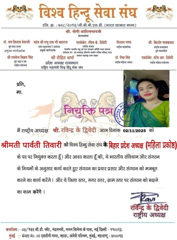 रक्सौल, पूर्वी चम्पारण १७ कार्तिक । सामाजिक सेवा र राष्ट्रहितको क्षेत्रमा सक्रिय भूमिका निर्वाह गर्दै आएकी श्रीमती पार्वती तिवारीलाई विश्व हिन्दू सेवा संघको बिहार प्रदेश अध्यक्ष (महिला प्रकोष्ठ) पदमा नियुक्त गरिएको छ। यो नियुक्ति संगठनका राष्ट्रिय अध्यक्ष श्री रविन्द्र के। द्विवेदीले गरेका हुन् ।