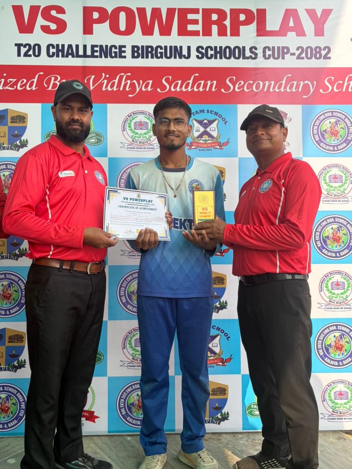 यस प्रतियोगिताको म्यान अफ द म्याच सोहेब शेख भए, उनले ३१ रन ३ विकेट लिएका थिए। अब उपाधिका लागि बाल एकता र ग्रीन ल्यान्ड सेकेन्डरी स्कूल भिड्नेछन । फाइनल खेलः बुधवार बिहान १० बजेदेखि स्थान नारायणी क्रिकेट ग्राउन्ड वीरगंजमा हुनेछ । विद्या साधन सेकेन्डरी स्कूलद्वारा आयोजना गरिएको भिएस पावरप्ले टि २० चैलेन्ज अन्तर्गत बुधवार फाइनल खेल हुनेछ ।