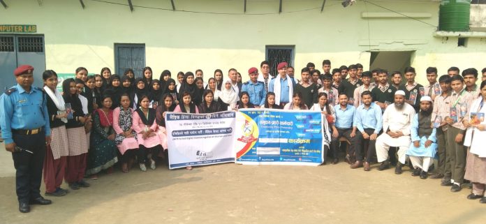 वीरगंज, १७ मंसिर । सामुदायिक प्रहरी साझेदारी कार्यक्रम अन्तर्गत सामुदायिक प्रहरी सेवा केन्द्र छपकैया–२ को आयोजनामा बिरगंज महानगरपालिका स्थित एम.इ.एस. सेकेन्डरी स्कुलका कक्षा १० का विद्यार्थीहरूलाई लक्षित गरी बाल–विवाहसम्बन्धी जनचेतनामूलक कार्यक्रम सफलतापूर्वक सम्पन्न भएको छ ।
