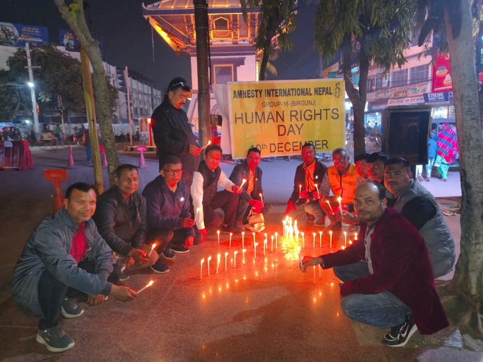 वीरगंज, २४ मंसिर । ७७ औँ अन्तर्राष्ट्रिय मानव अधिकार दिवसको अवसरमा एमनेस्टी इन्टरनेशनल नेपाल, समूह–१६ बिरगंजले घन्टाघर क्षेत्रमा दीप प्रज्वलन कार्यक्रम भव्य रूपमा सम्पन्न गरेको छ । मानव अधिकारको संवर्द्धन तथा संरक्षणप्रति जनचेतना अभिवृद्धि गर्ने उद्देश्यले आयोजित कार्यक्रम स्थानीय समुदाय तथा विभिन्न अभियन्ताहरूको सक्रिय सहभागितामा सम्पन्न भएको हो ।