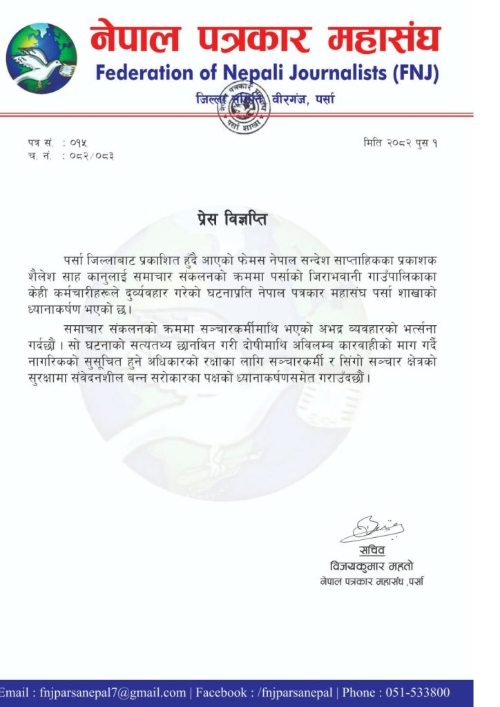 यसैबीच नेपाल पत्रकार महासंघ, पर्सा शाखाले पनि आज प्रेस विज्ञप्ति जारी गरी पर्सा जिल्लाबाट प्रकाशित हुँदै आएको फेमस नेपाल सन्देश साप्ताहिकका प्रकाशक शैलेश साह कानूलाई समाचार संकलनको क्रममा पर्साको जीराभवानी गापाका केही कर्मचारीहरुले दुव्र्यवहार गरेको घटनापति ध्यानाकर्षण भएको जनाएको छ ।